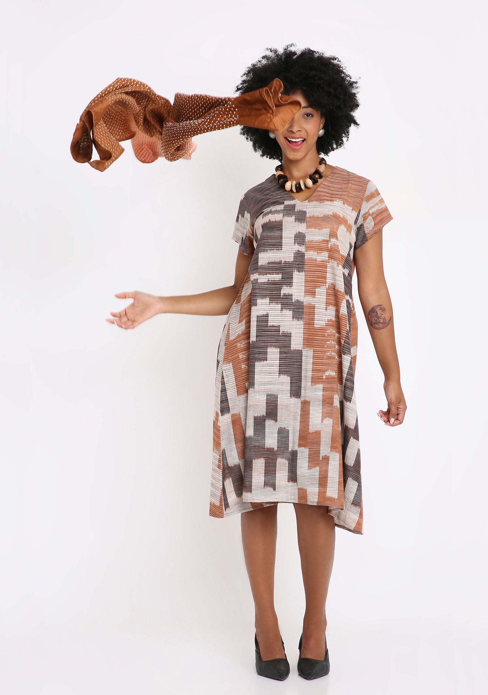 Colours of the earth, handwoven in bold blocks of browns,ochres & peach characterize this unusual ikat cotton dress. Woven by traditional weavers of Pochampally, this one of a kind dress with a space dyed texture is truely special.Paired with a light ikat jacket in shades of jade and you have a perfect semi formal outfit to flaunt into the night