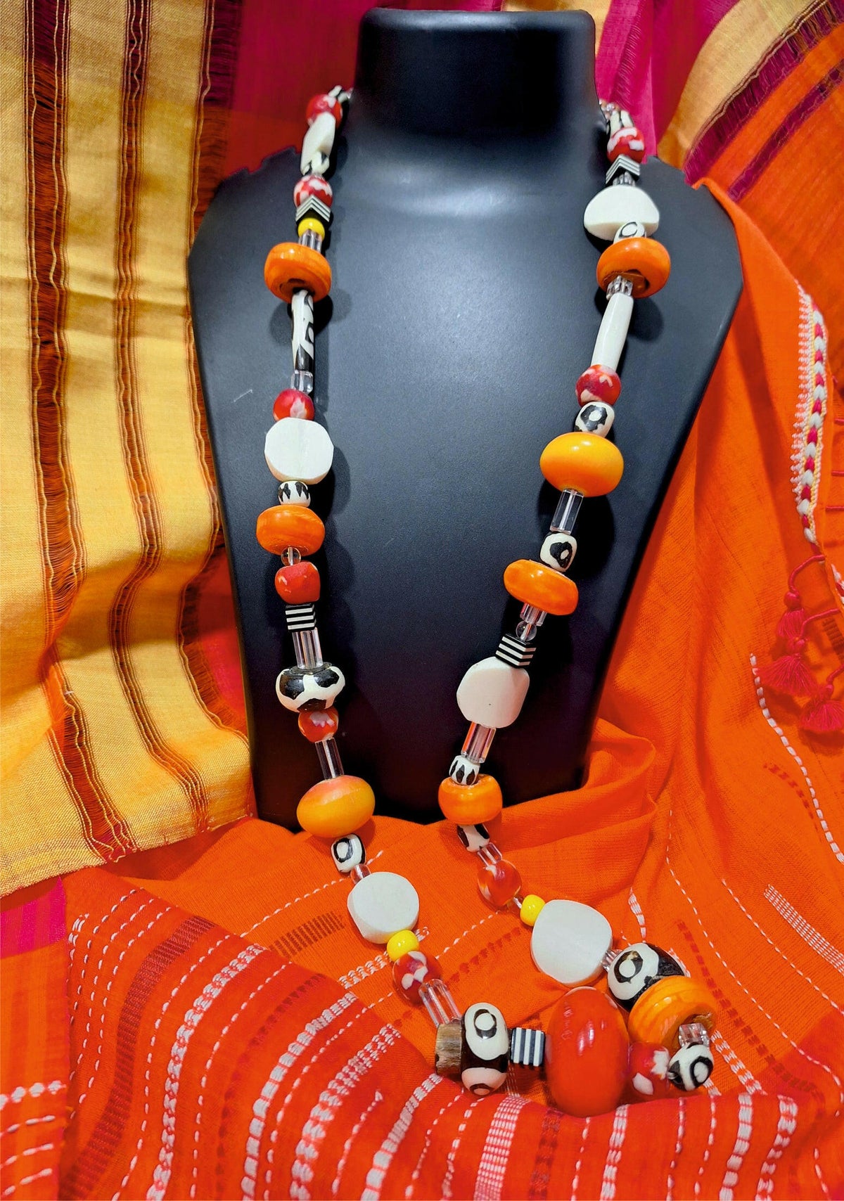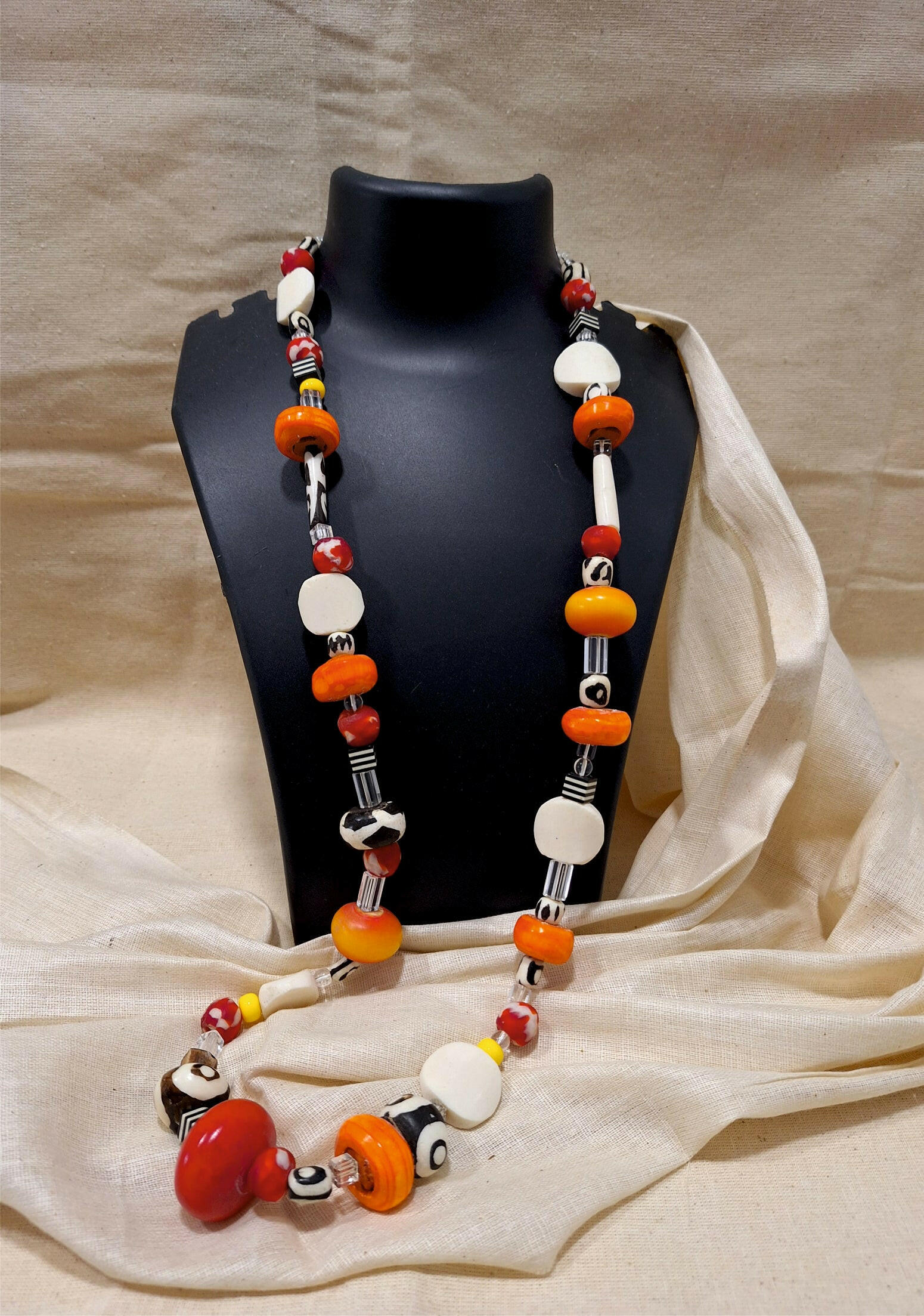 Material: A flirty 40-inch single line necklace with an assortment of African black & whites, opaque rounds, fluted & cubic acrylic, bone, crystal & glass beads all in a row!