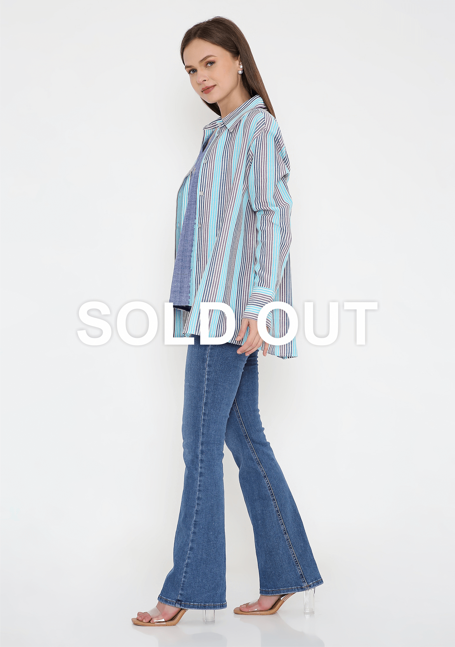 A bold patched and patterned ikat top woven in Pochampally is teamed with a fine striped cotton shirt woven in Maheshwar. A wonderfull mix of contrasting patterning techniques coming together in harmony