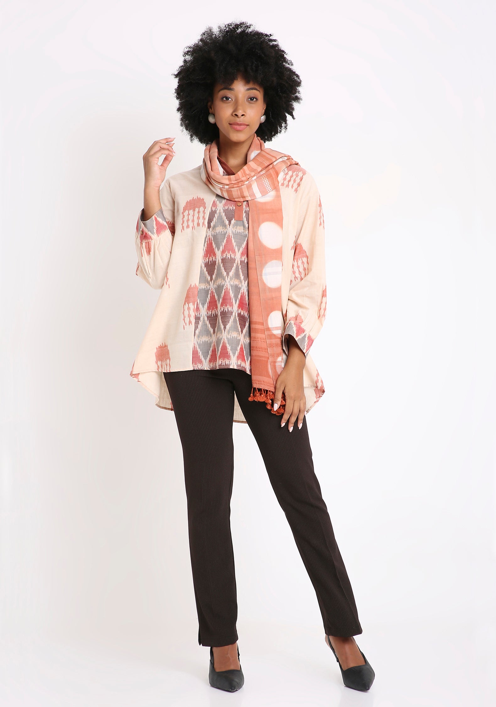 handwoven Vankaam stole from Kutch with bold circles clamp dyed with natural dyes. This fun top can be paired with pants and skirtsin colours drawn from the outfit.